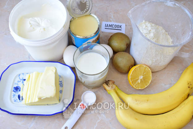 Чтобы приготовить торт «Молочная девочка» с киви и бананом, подготовьте необходимые ингредиенты. Сливочное масло необходимо заранее достать из холодильника и дать ему полежать при комнатной температуре, чтобы оно стало мягким. Бананы выбирайте наиболее спелые и ароматные. Киви должны быть слегка мягкими.