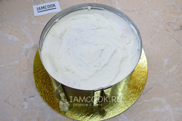 Так соберите весь торт. Сверху смажьте отложенным кремом и затяните торт в кольцо для сборки. Это необходимо для того, чтобы торт при застывании стал ровным. Уберите торт в холодильник на несколько часов для пропитывания и застывания.