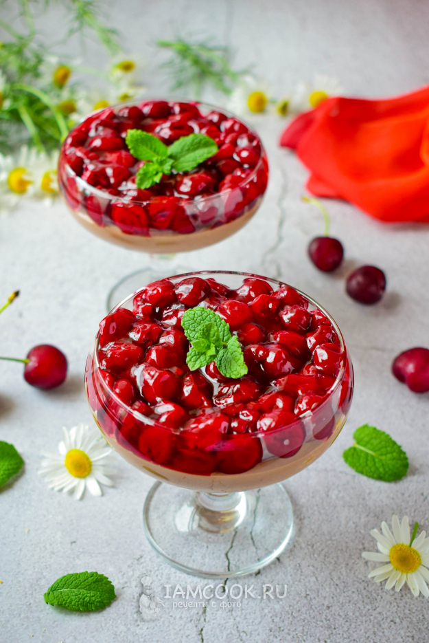 Для вишневого слоя вишню смешайте с сахаром и крахмалом. Поставьте на огонь и доведите до кипения. Помешивайте, чтобы вишня не подгорела. Если в ягодах будет мало сока, то можно подлить немного воды. При нагревании вишневая масса загустеет немного. Готовый вишневый слой остудите.