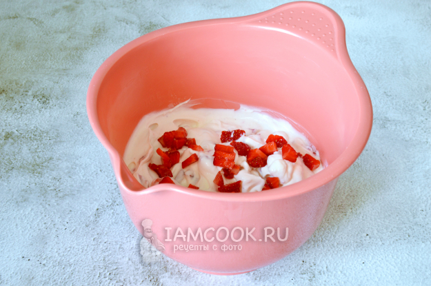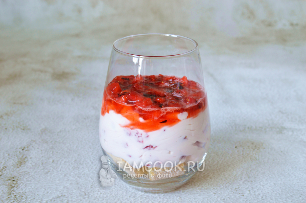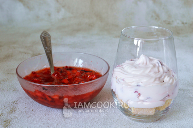 Смешать маскарпоне с йогуртом и сахарной пудрой, добавить оставшуюся клубнику и аккуратно перемешать.