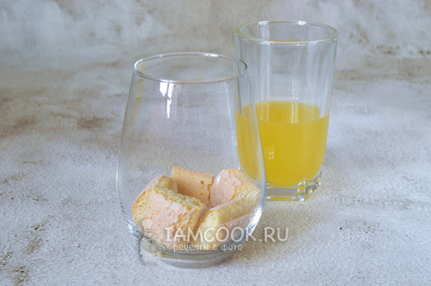 На дно порционных стаканов выложить по 5 кусочков печенья, сбрызнуть их апельсиновым соком.