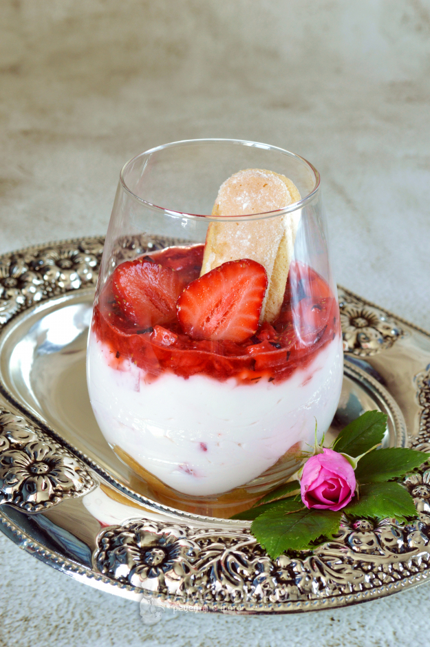 По желанию клубничный десерт в стаканах можно украсить печеньем, клубникой и листочками базилика.