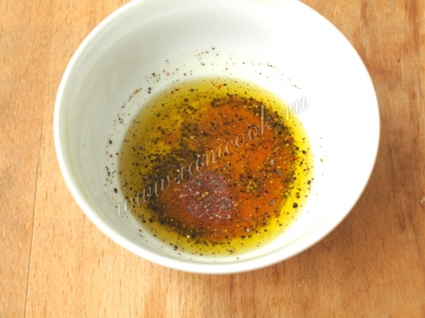 Для заправки соединить оливковое масло с винным уксусом и смесью перцев.