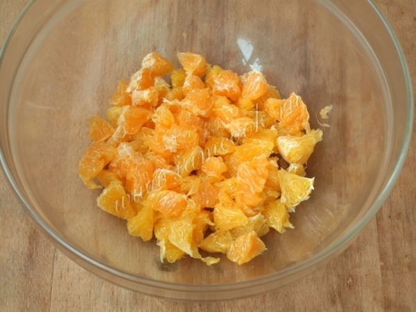 Апельсин и мандарин очистить от плёночек и сложить в салатник.