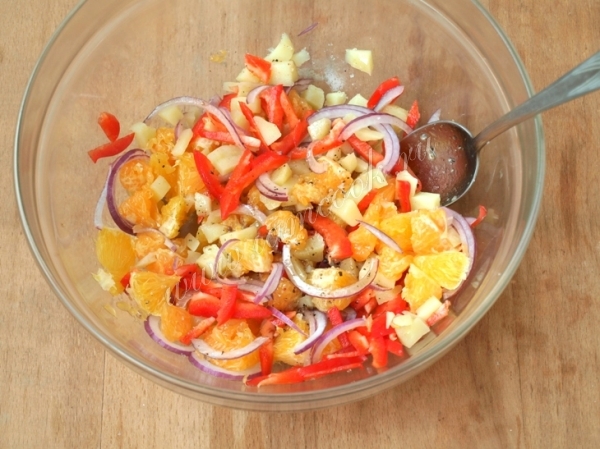 Полученную заправку добавить в салат и хорошо перемешать. Если потребуется - добавить соль.