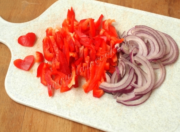 Лук нарезать полукольцами тонко и соломкой сладкий перец. Перец желательно взять красного цвета, тогда краски салата будут очень красиво сочетаться. Из кусочков перца вырезать сердечки для украшения.