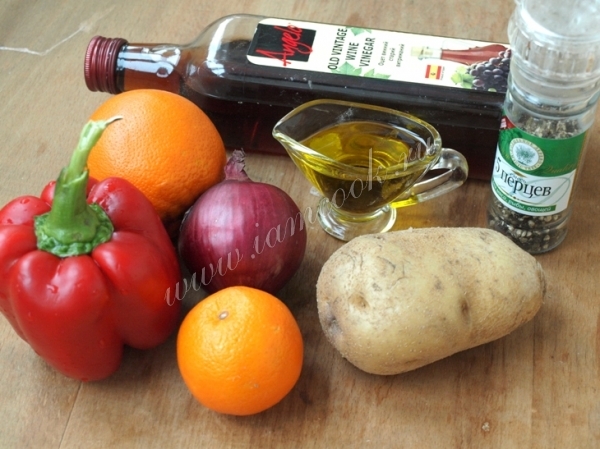 Для салата нам понадобится сладкий перец (можно использовать половину), апельсин, мандарин, картофель, фиолетовый лук, винный уксус, смесь перцев и оливковое масло. Соль можно добавить по вкусу.