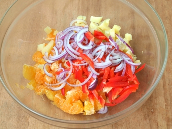 В салатник с цитрусовыми добавить картофель,перец и лук.