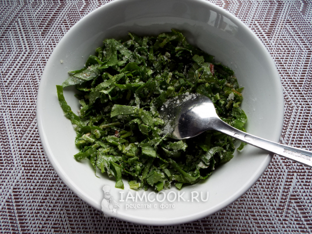 Пока тесто отдыхает, нарезать щавель.
