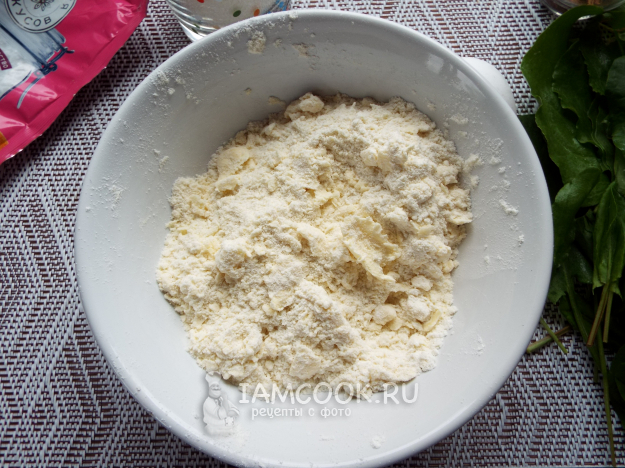 Муку соединить с разрыхлителем. Добавить кубики масла.