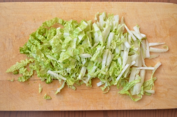 Листья китайской капусты промыть, просушить на полотенце, нарезать соломкой.