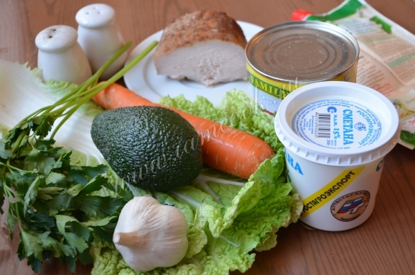 Салат посолить, поперчить по вкусу, добавить сметану и майонез (или только сметану). Перемешать салат.
