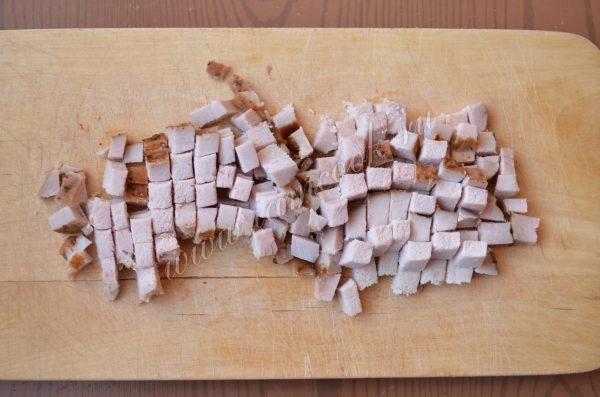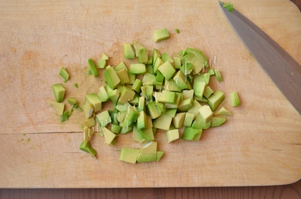 Авокадо очистить от кожуры, мякоть нарезать кубиками.