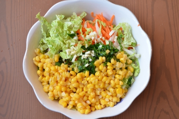 Соединить все ингредиенты вместе, добавить к ним кукурузу и мелко нарезанные чеснок и петрушку.
