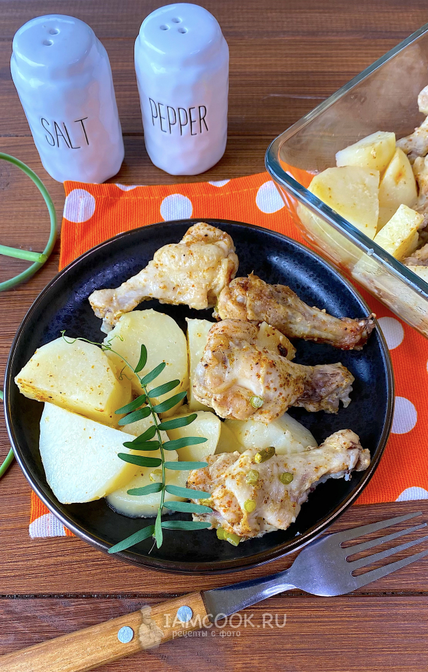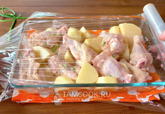 Выложите картошку с курицей в форму для СВЧ, затяните пищевой пленкой. Поставьте в микроволновую печь, установите полную мощность и запекайте минут 20-25. Время зависит от размера картошки и курицы. После приготовления не доставайте блюдо сразу, оставьте картошку с курицей в микроволновке минут на 10.