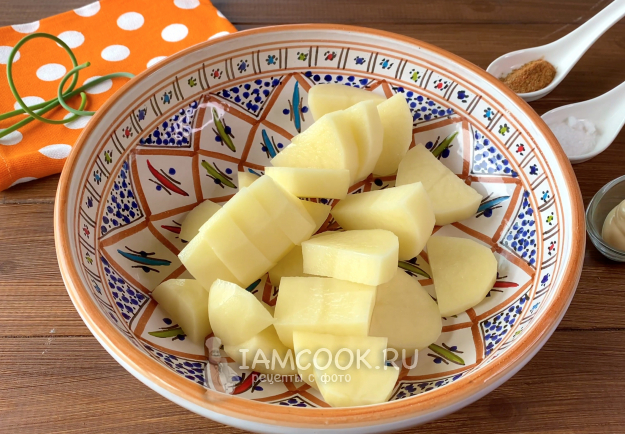 Промойте и очистите картофель, нарежьте на кусочки и выложите в миску.