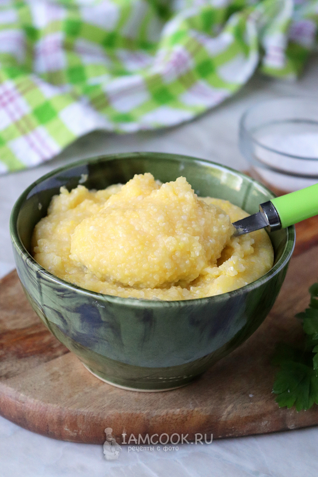 Сегодня будем варить рассыпчатую кукурузную кашу на воде в кастрюле. Чтобы она получилась действительно рассыпчатой, нужно её варить в небольшом количестве воды. Как правило, такую кашу варят, соблюдая пропорции 1:3 или 1:3,5, тогда она получается нежной и более вязкой, сегодня мы будем варить в соотношении 1:2,5 и получим желаемую консистенции. Время варки - от 10 до 15 минут на медленном огне, но после этого каша должна обязательно настояться под крышкой ещё минут 10. Подают её со сливочным маслом, добавлять его можно и в кастрюлю, и непосредственно каждому в тарелку.