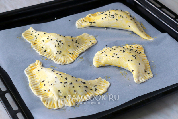 Поверхность слоек смажем взбитым яйцом и посыплем семенами кунжута.