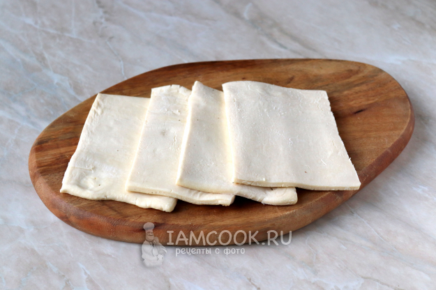 Тесто заранее достаём из морозильной камеры. Его можно оставить на столе, чтобы оттаивало при комнатной температуре, или же на нижней полке холодильника. Разрежем пласт теста на 4 части.