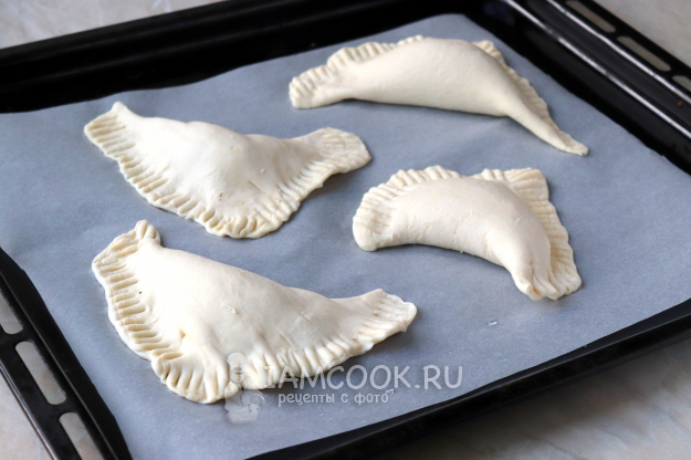 Соединим два противоположных края и плотно защипаем тесто, в результате должен получиться аккуратный треугольник. С помощью вилки нанесём красивый узор. Таким образом создадим все заготовки (у меня получилось 4 штуки).