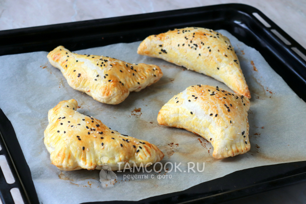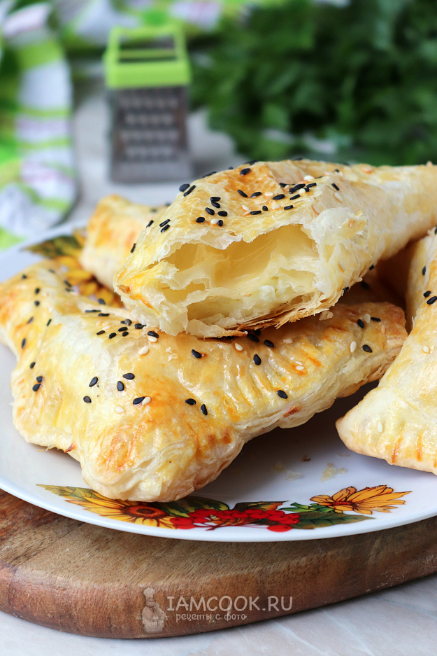 Слойки с адыгейским сыром из слоеного теста получаются очень вкусными и сытными. На стол их можно подавать и в тёплом, и в остывшем виде.