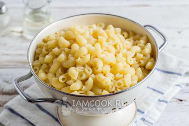 Макароны отварите согласно инструкции на упаковке до состояния «al dente», откиньте на дуршлаг, чтобы стекла лишняя жидкость.