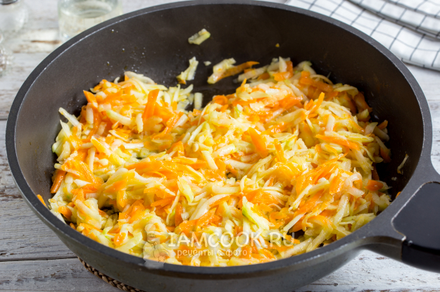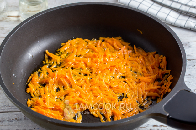 В большой сковороде разогрейте немного растительного масла. Морковь очистите и натрите на крупной тёрке. Обжарьте морковь 2-3 минуты на сильном огне. Если будете добавлять лук, то его следует обжарить в этом шаге вместе с морковью.