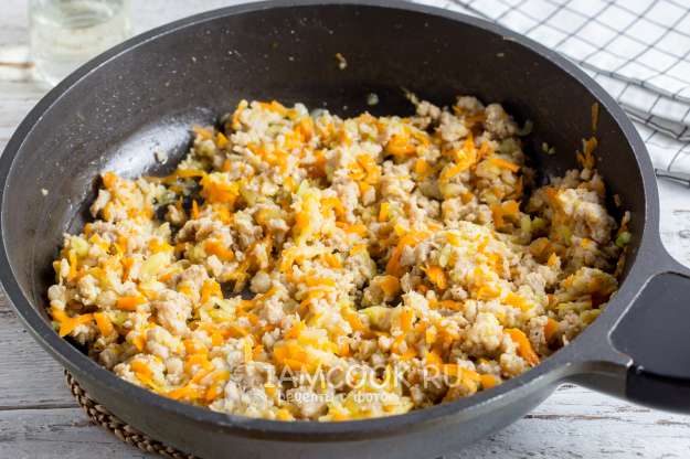 Добавьте фарш и, постоянно помешивая и разбивая крупные кусочки фарша, обжаривайте его до выпаривания жидкости в сковороде. В конце добавьте соль и перец по вкусу.