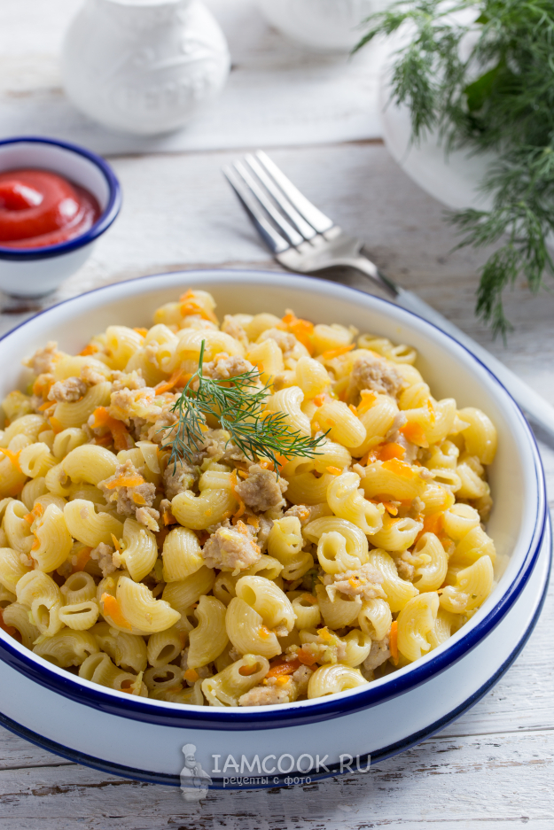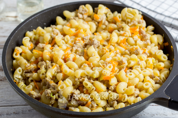 Добавьте макароны к фаршу с овощами, перемешайте и попробуйте на соль, при необходимости добавьте. Снимите сковороду с огня и можете подавать на стол.