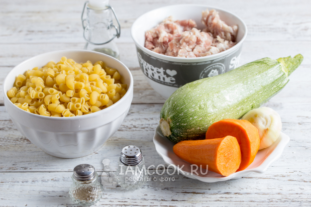 Возьмите указанные продукты для приготовления макарон по-флотски с кабачками и фаршем. Фарш у меня домашний - курица/свинина, он уже с луком, но если возьмёте чистый фарш, то следует добавить лук. Маленький кабачок и средняя морковь. Но количество овощей можно варьировать по своему вкусу.