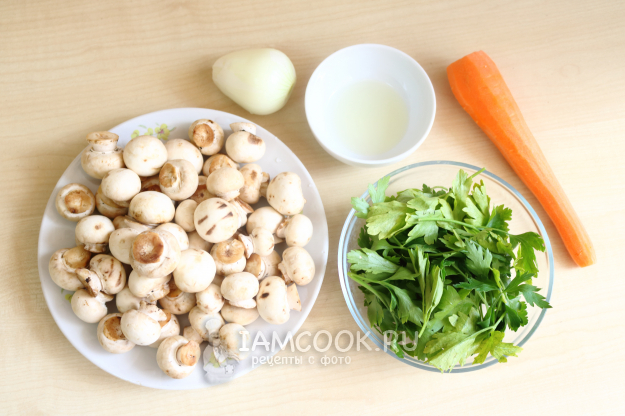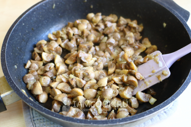 Шампиньоны промойте, нарежьте также небольшим кубиком и потушите вместе с луком и щепоткой соли до выпаривания жидкости. Это займёт 10 минут. Грибы заметно уменьшатся в объёме.