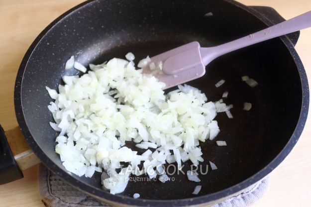 Лук очистите, нарежьте мелким кубиком, потомите на растительном масле 2-3 минуты.
