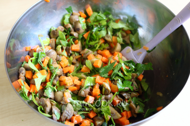 Соедините подготовленные компоненты в удобной миске и перемешайте до однородности. Начинка из грибов и моркови готова!