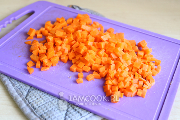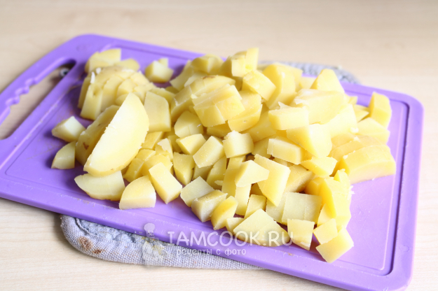 Картофель запеките и отварите в мундире, остудите, снимите кожуру и нарежьте кубиком.