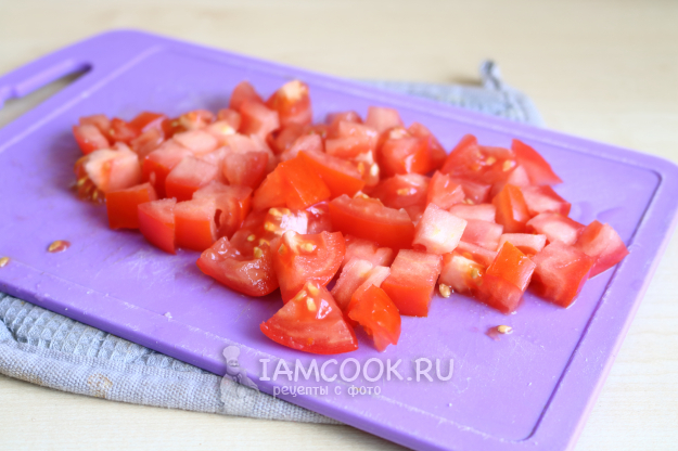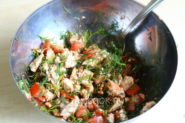 Соедините подготовленные ингредиенты в удобной миске, всыпьте щепотку соли и копчёную паприку и перемешайте до однородности. Вторая начинка из курицы и помидора готова!