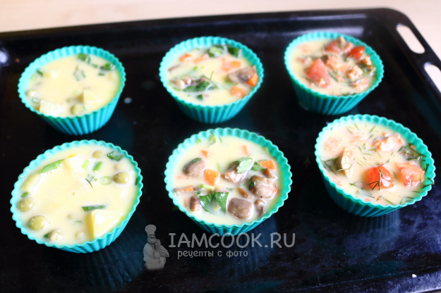 Затем в каждую форму влейте яичную массу, оставляя сверху тонкий свободный край, учитывая, что маффины во время выпекания будут подниматься. На каждую формочку с начинкой примерно будет уходить 3 столовые ложки яиц.