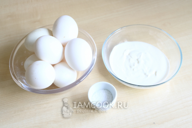 В миску разбейте яйца, сразу добавьте сметану и щепотку соли.