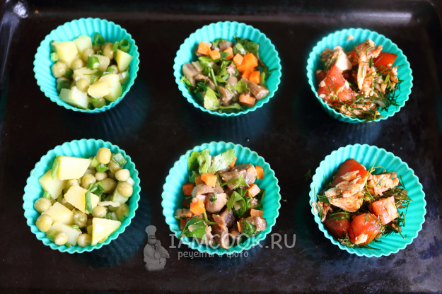 Переходим к формовке маффинов. В специальные силиконовые формочки выложите начинку так, чтобы она почти полностью заполняла объём.