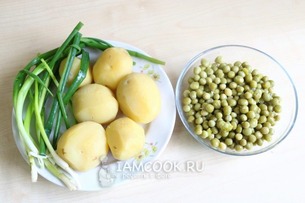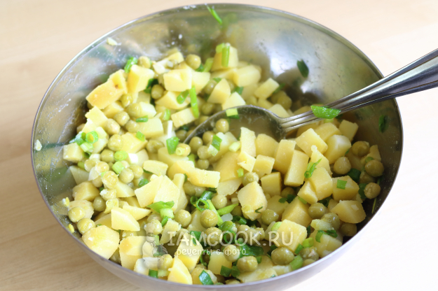Соедините в миске картошку, лук и зелёный консервированный горошек. Подсолите и перемешайте до однородности. Третья начинка из картошки и горошка готова!