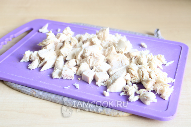 Куриное филе отварите в подсоленной воде до готовности, остудите. Нарежьте кубиком.