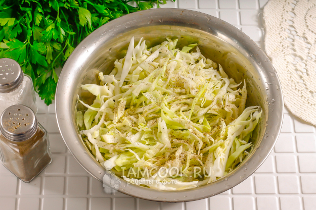 Тщательно вымешайте все содержимое емкости с нажимом в течение 2-3 минут, чтобы вся капустная нарезка просолилась и выпустила сок, уменьшилась в объеме.