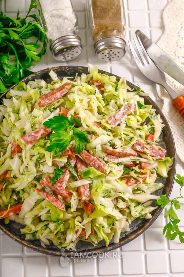 Промойте свежую зелень и стряхните лишнюю влагу. Измельчите ее и добавьте в емкость. Аккуратно перемешайте всё содержимое емкости, приподнимая капустную нарезку со дна. Если у вас есть свободное время, то поместите салат в холодильник минимум на 20-30 минут, чтоб он весь пропитался колбасным ароматом - так блюдо станет еще вкуснее.