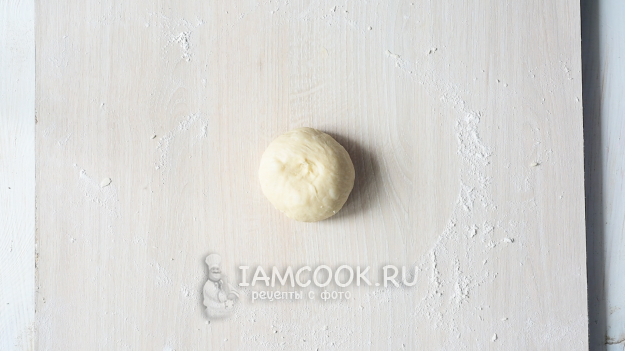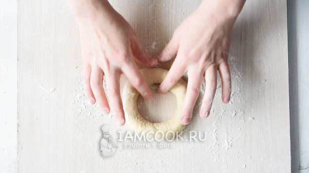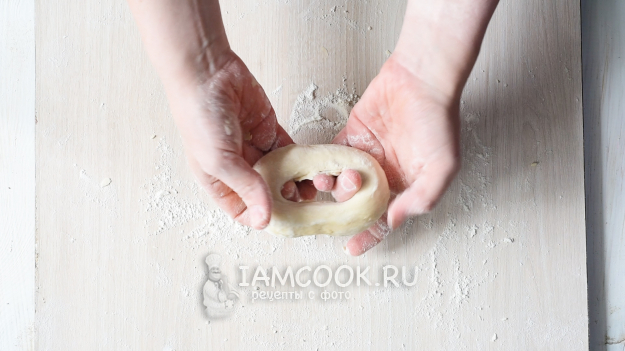 Одну часть теста подкатаем руками до получения шарика. Большим пальцем продавим в центре шарика из теста отверстие насквозь.