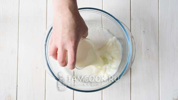 В просторную миску засыплем весь сахар и зальем теплое (35-36 градусов) молоко.