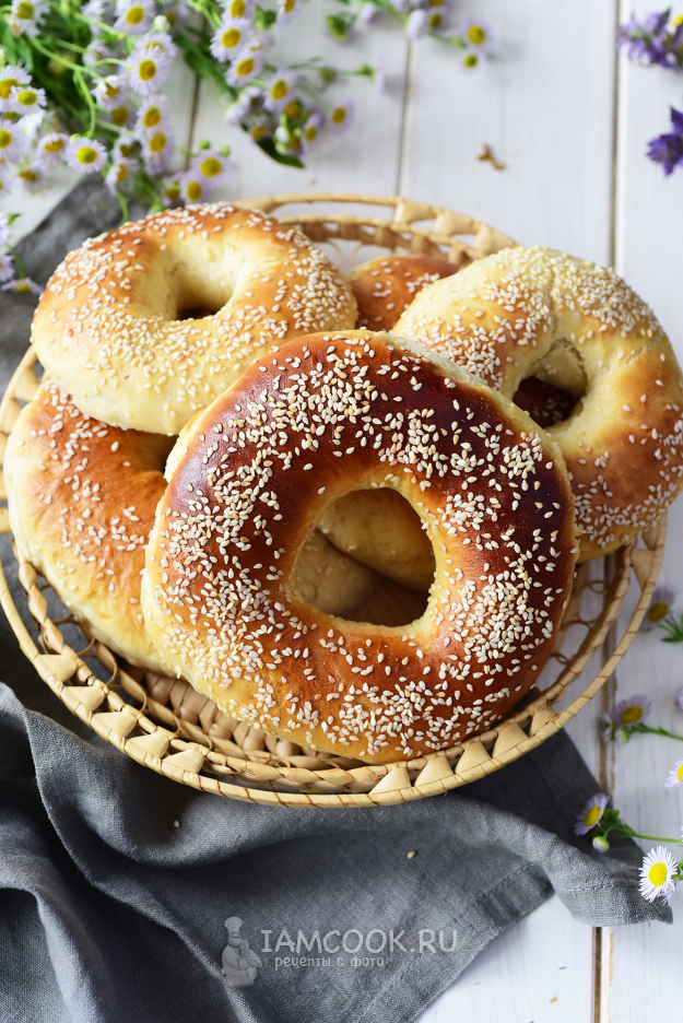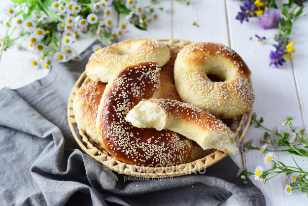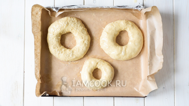 Все заготовки калачей выложим на противень, застеленный пергаментом для выпекания. Каждую заготовку смажем кистью взболтанным яйцом и присыплем кунжутом по вкусу. Выпекать молочные калачи будем в заранее разогретой до 180 градусов духовке 20-25 минут до аппетитного румянца.