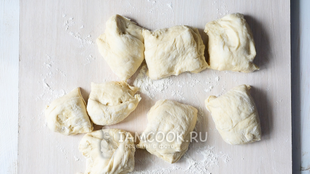 Рабочую поверхность присыплем мукой и выложим все тесто. Поделим тесто на 8-9 частей, можно разного размера.
