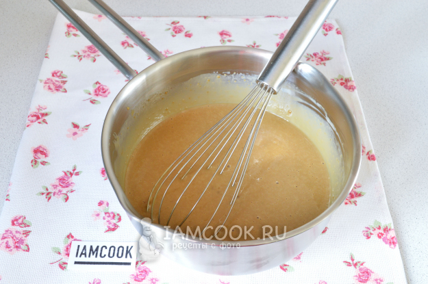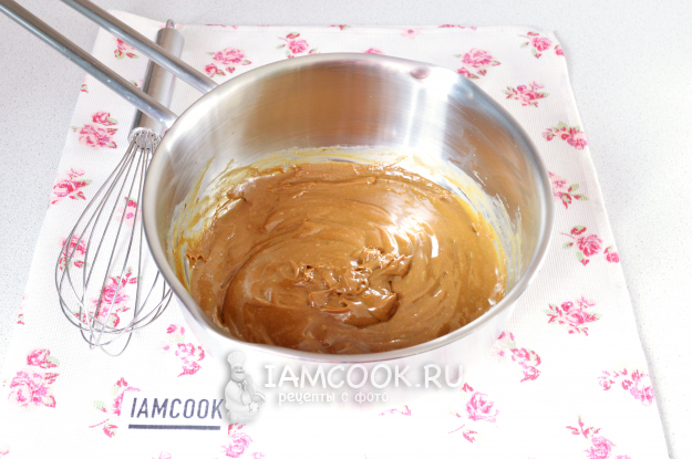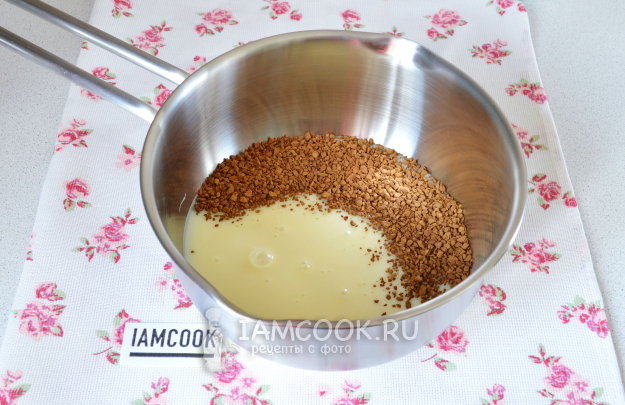 Поставить кастрюлю на минимальный огонь и нагревать, постоянно помешивая, до растворения кофе. Масса в процессе нагревания загустеет.