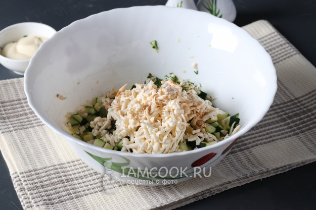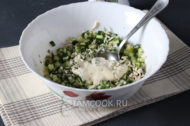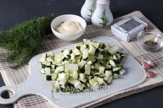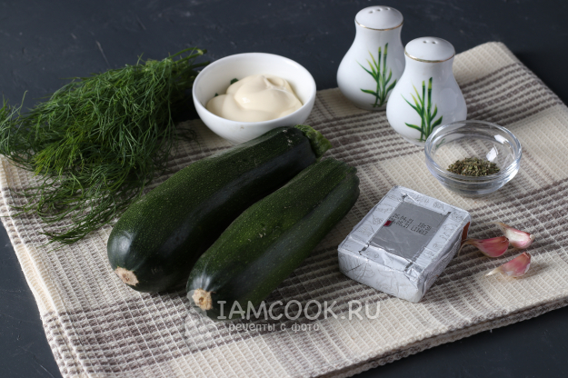 Для приготовления салата из сырых кабачков с сыром подготовить из списка необходимые ингредиенты.