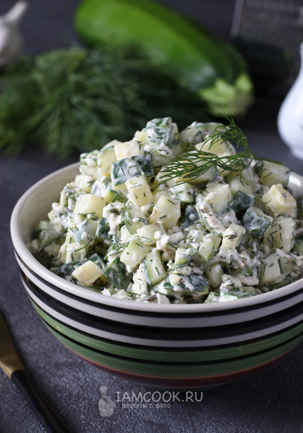 Салат из сырых кабачков с сыром готов. Выложить его в подходящий салатник и подать к столу.