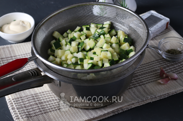 В кастрюле вскипятить воду. Кабачки сложить в миску и залить кипятком на одну минуту, затем горячую воду слить и промыть кабачки холодной водой, чтобы остановить процесс варки. Кабачки выложить на сито, чтобы стекла лишняя вода.